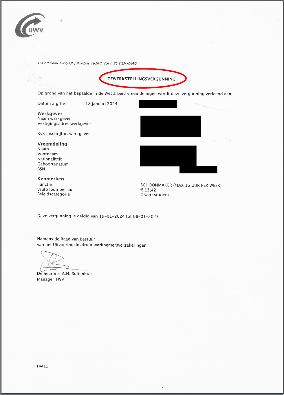 - De wergever heeft voor de werknemer een tewerkstellingsvergunning bij het UWV gekregen.